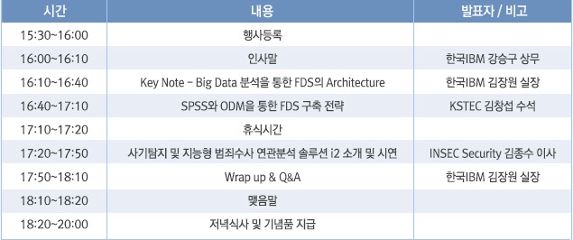 급속도로 변화하는 비즈니스 환경에서 대용량의 데이터를 분석하여 패턴을 파악하고 분석하여 통찰력을 높이며, 각종 금융사기에 대응방안을 수립하는 것은 매우 중요합니다. 본 세미나는 이러한 각종 금융사기 위협에 직면한 고객 여러분들이 최적화된 대응방안을 수립하고, 구현하는데 도움을 드릴 것이며 은행, 증권, 보험, 신용카드사의 사기 탐지 및 분석 시스템을 주제로 고객 여러분께 솔루션을 드릴 것입니다.